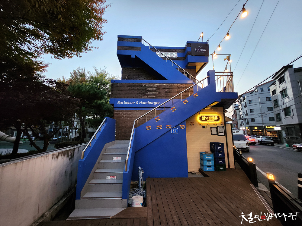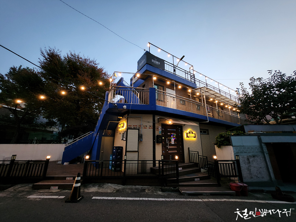 주변 건물들과 동떨어진 듯한 파란색의 이쁜 건물