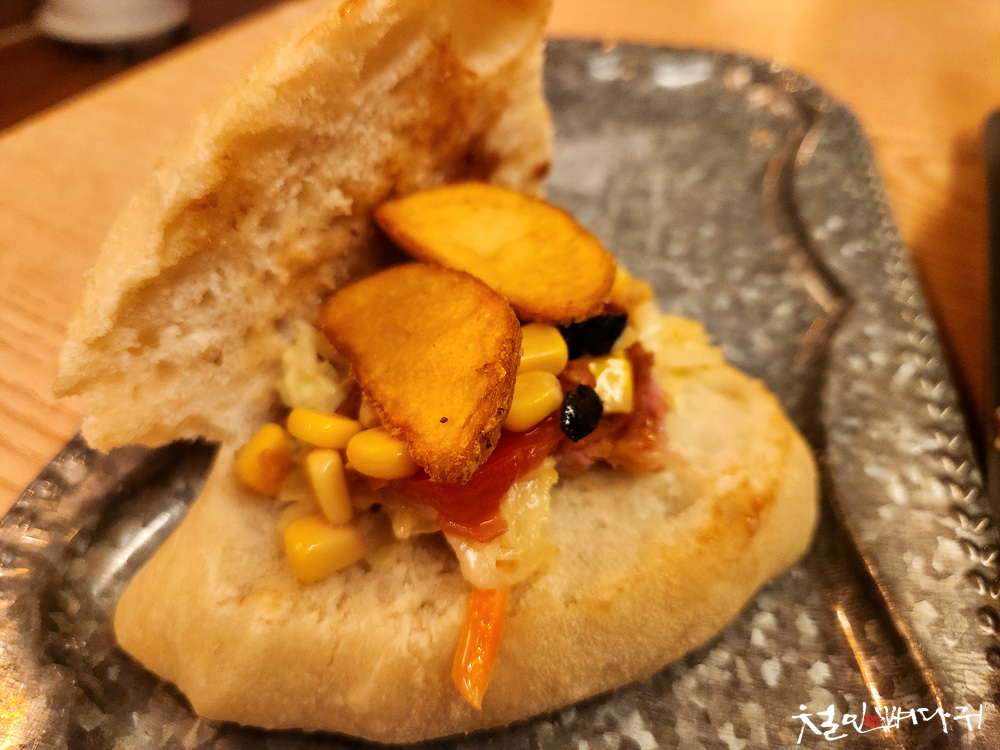 토핑들을 넣어서 햄버거처럼 먹습니다.