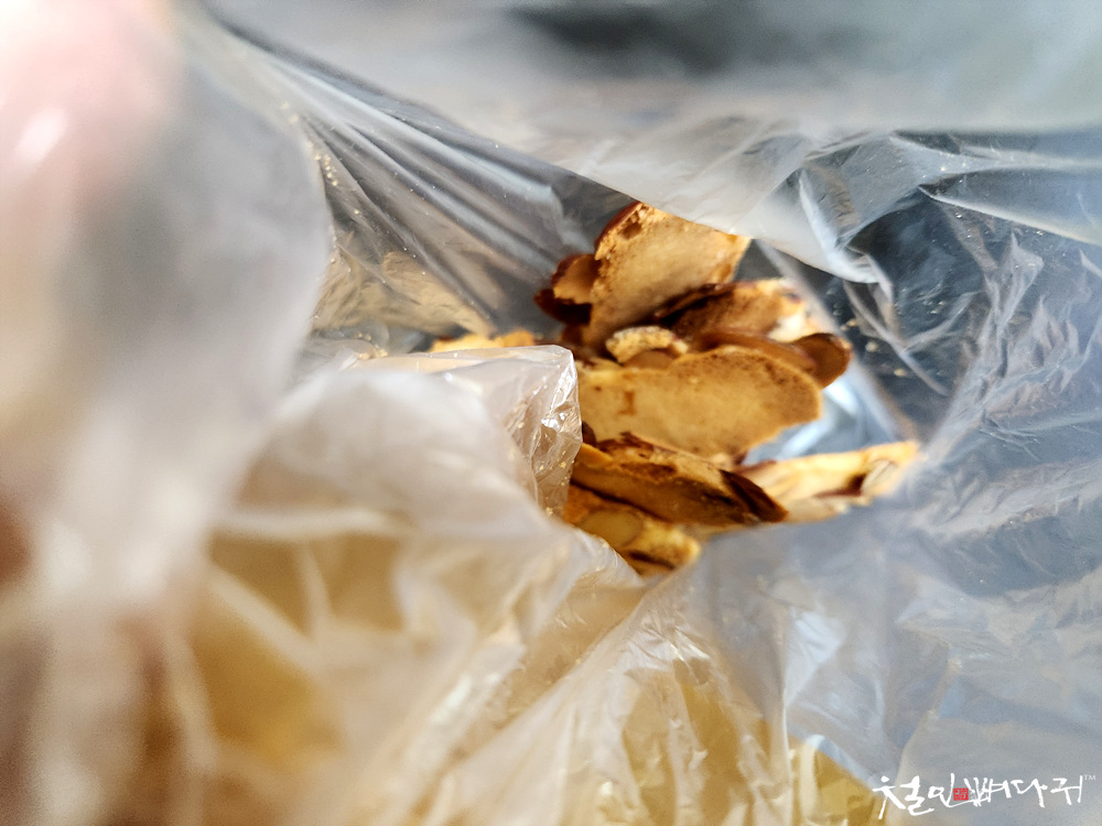 비닐로 덮여진 곳 아래 빵들이 숨어 있네요.