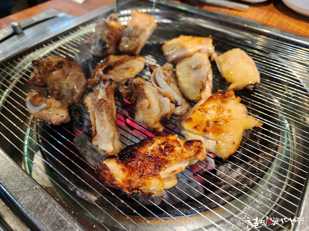 양념이 없는 닭고기부터 숯불에 구워서 먹습니다.