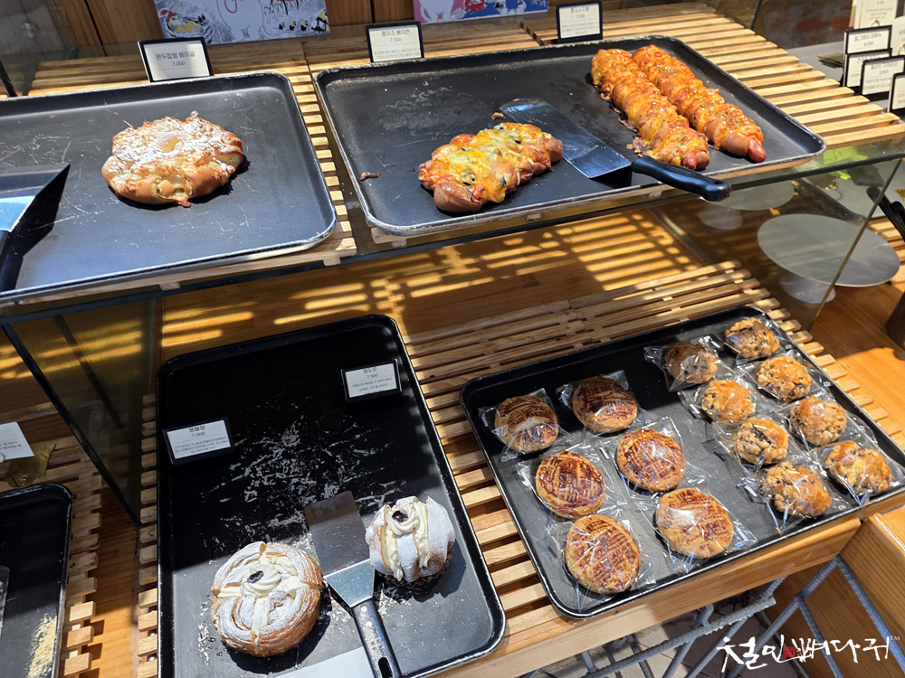 빵들이 진열되어 있습니다.