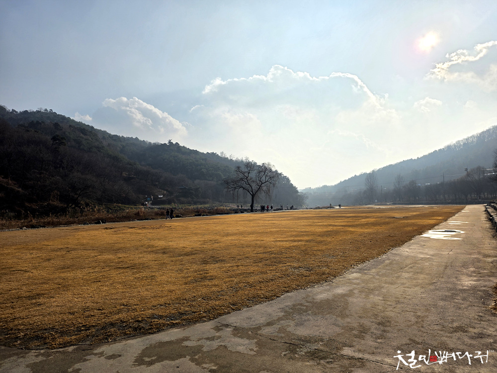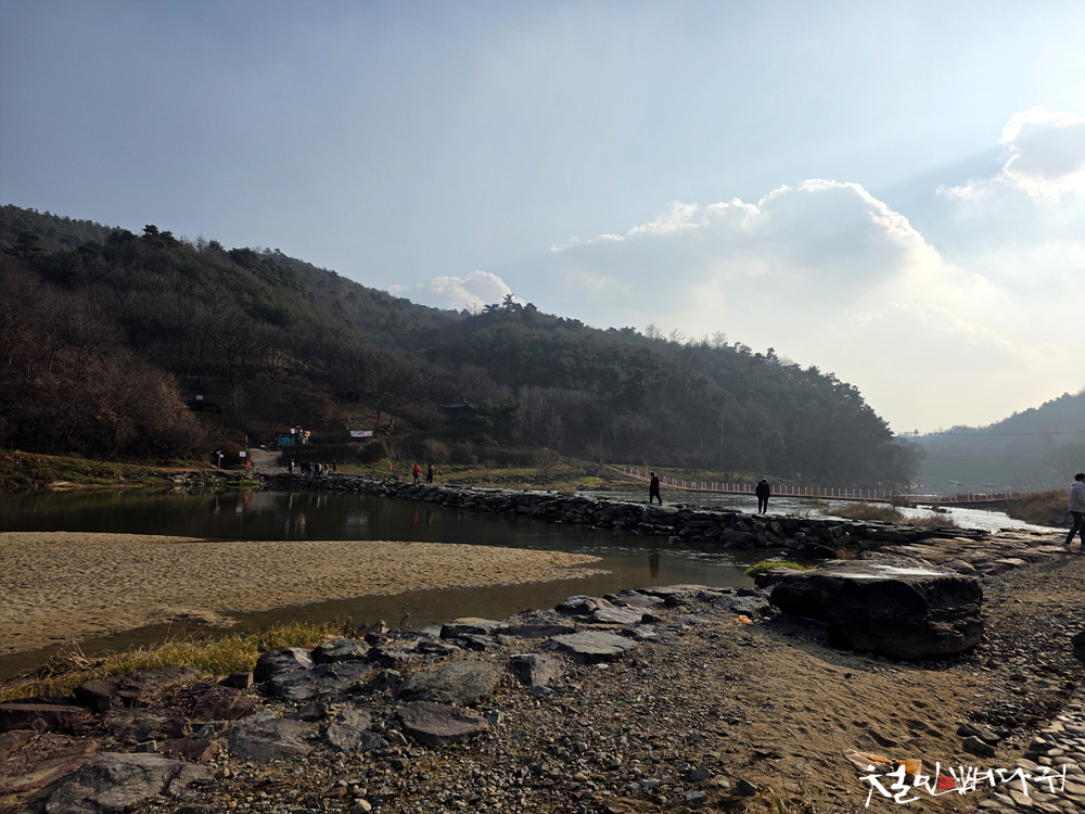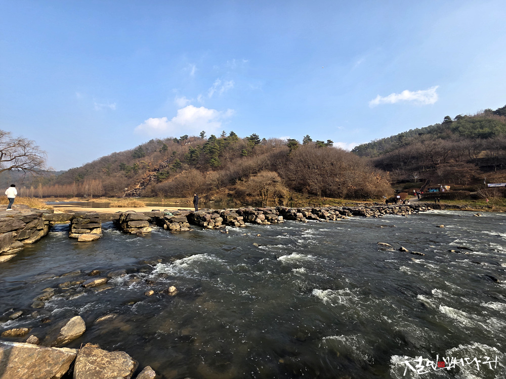 넓은 잔디밭을 지나 나무가 있는 쪽에 농다리가 있습니다.
