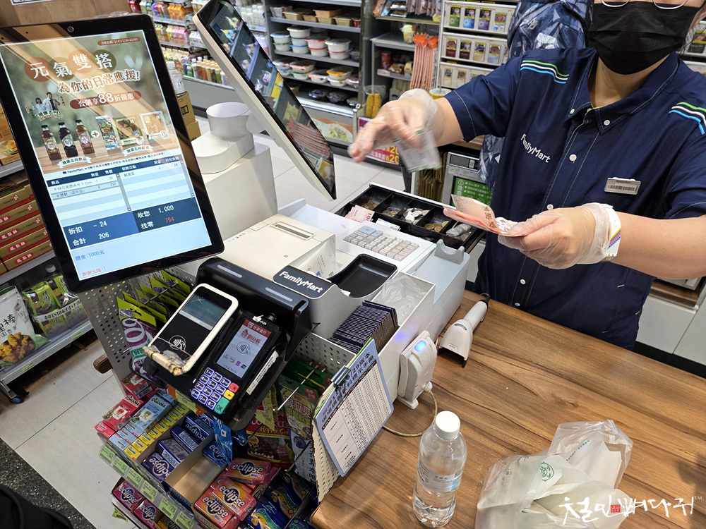 도착 후, 편의점에서 물 한 병을 구입합니다.