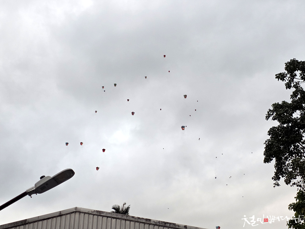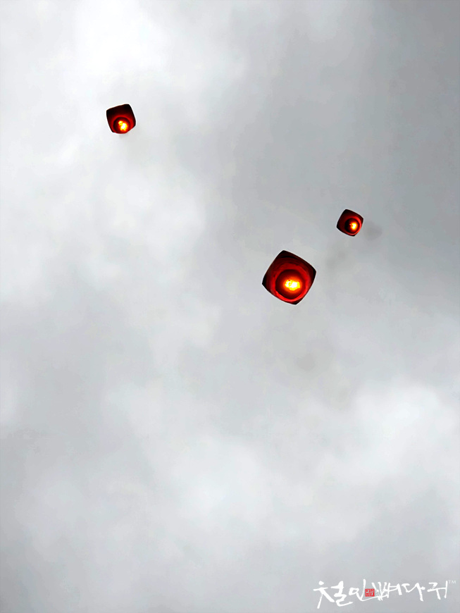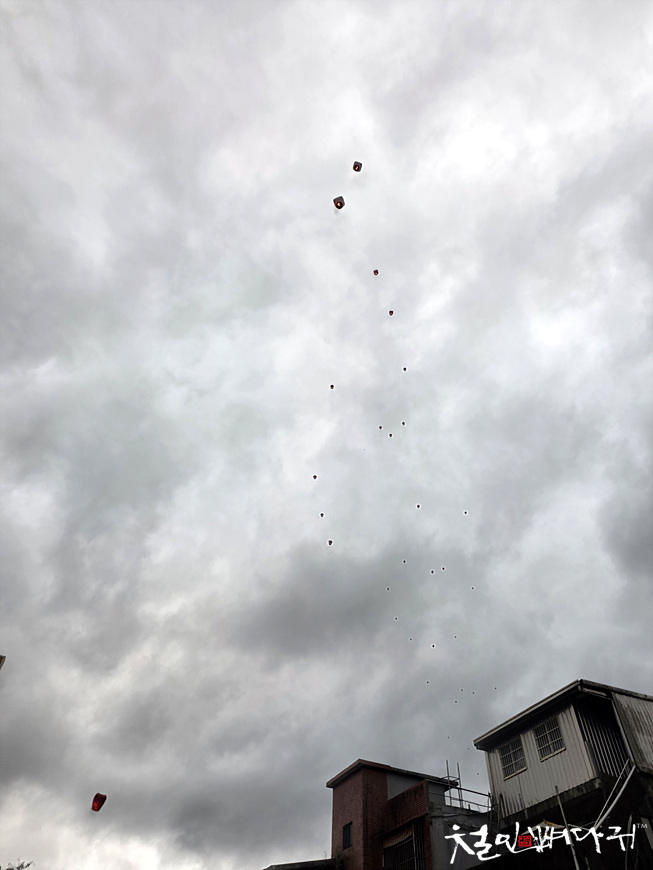 흐린 하늘에는 수많은 천등이 하늘로 올라가고 있습니다.