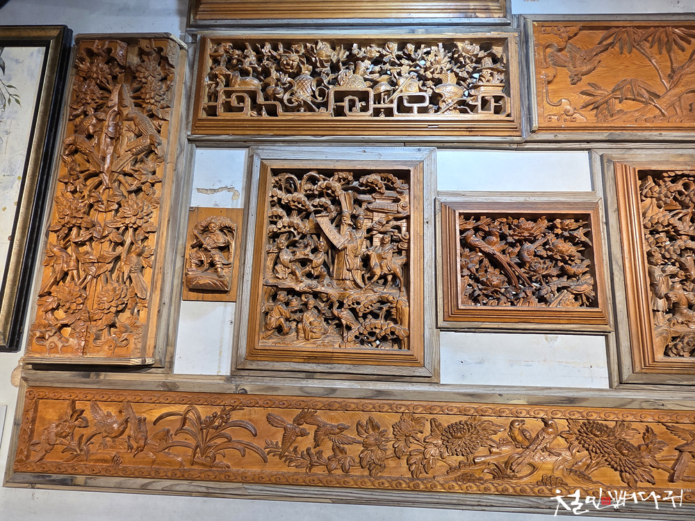 벽면에 나무를 깍아서 만든 장식이 액자처럼 진열되어 있습니다.