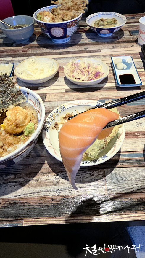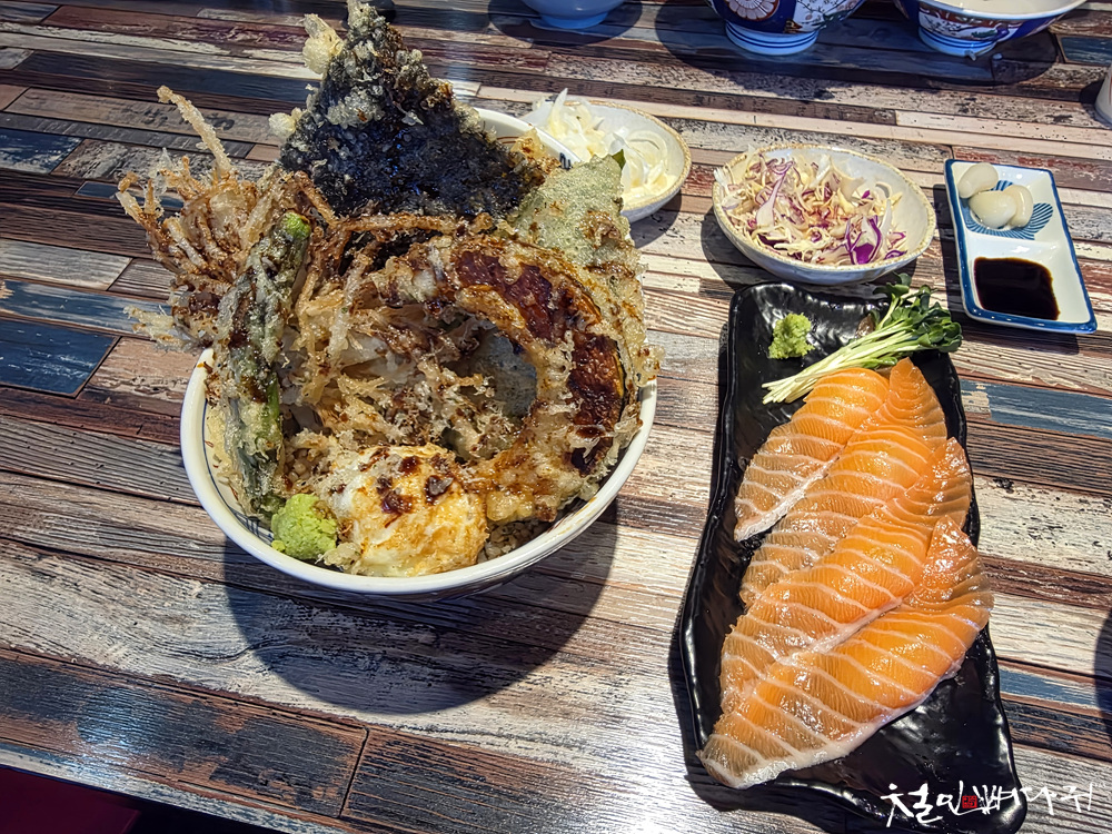 야채튀김덮밥과 연어초밥이었습니다.