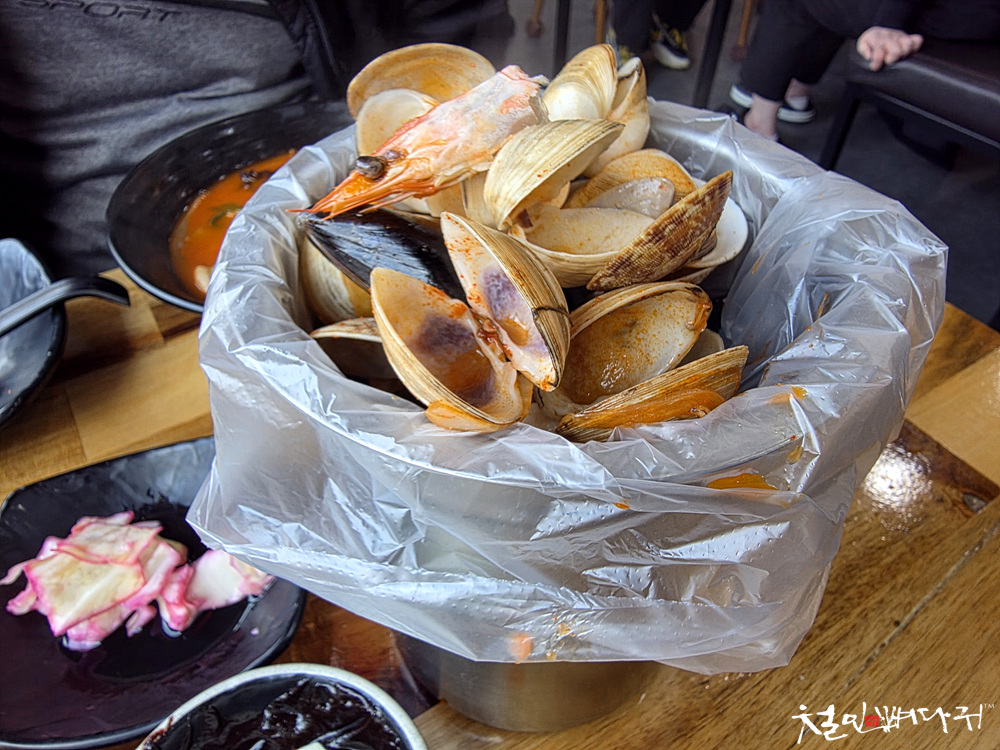 2명이 짬뽕 먹으면서 건져놓은 조개류 껍질들.