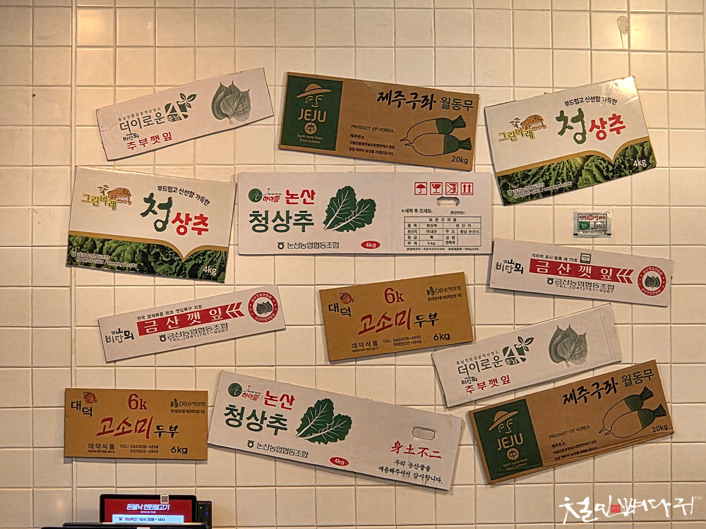 공급받는 농산물 박스를 벽에 인테리어로 붙여놓았네요.