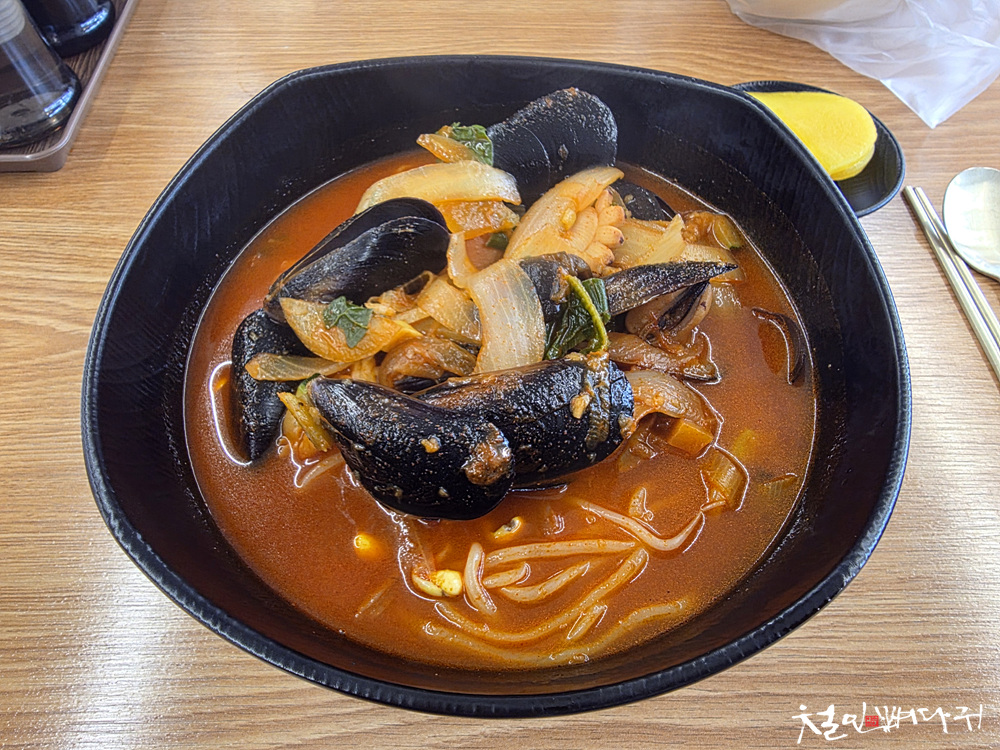 콩나물이 들어있는 얼큰한 짬뽕입니다.