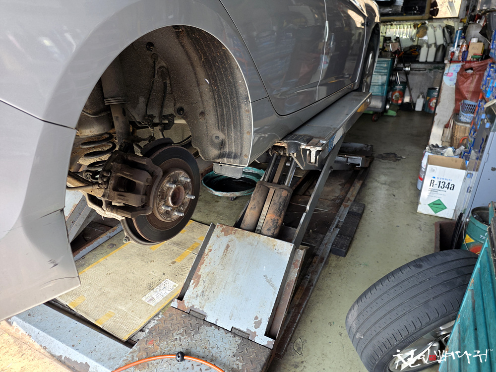 2인 1조로 브레이크 오일 공기 빼기도 해 줍니다.
