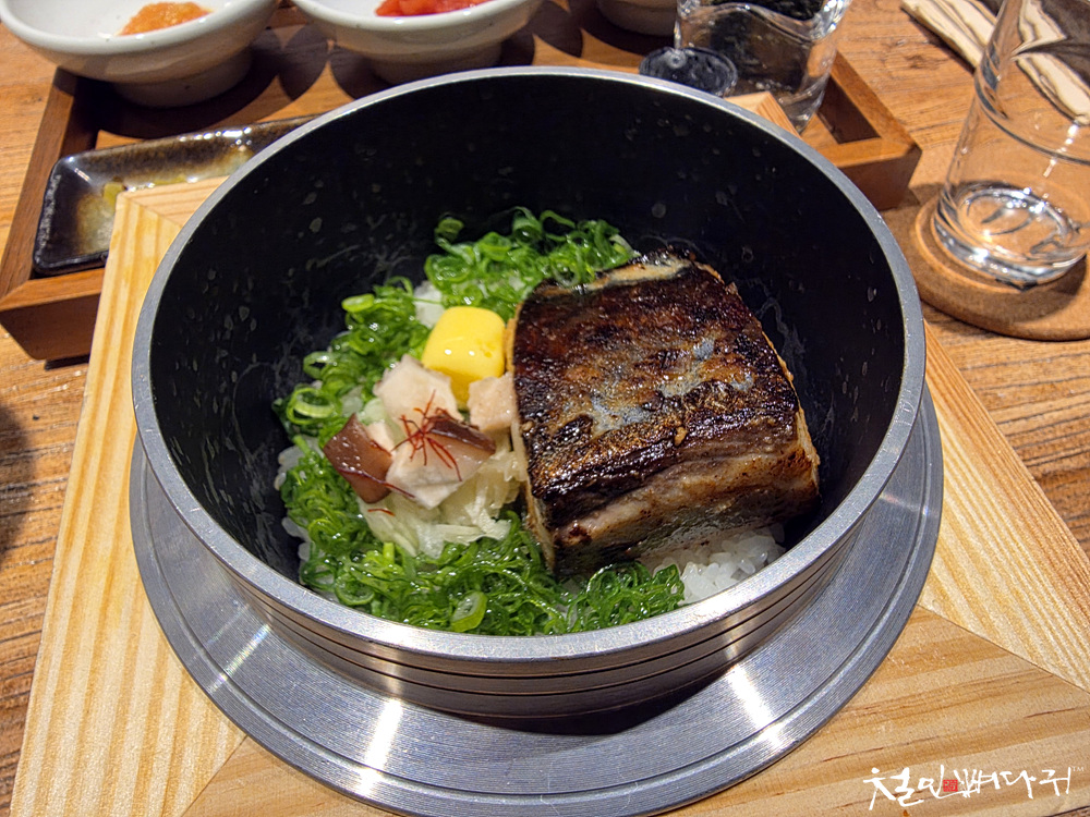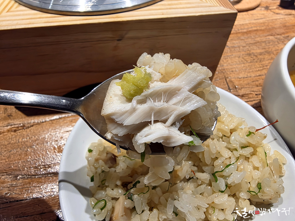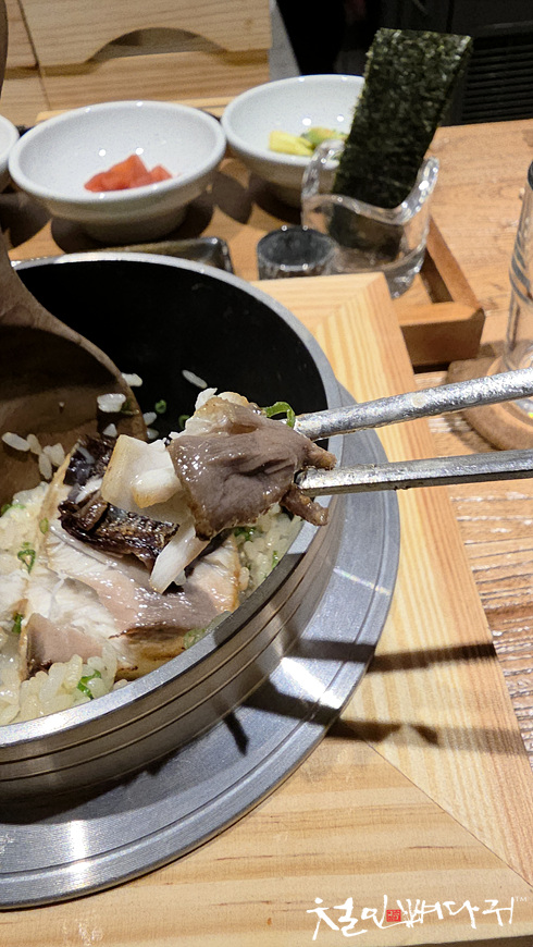 솥밥에 두툼한 삼치가 구워져 올려 나옵니다.