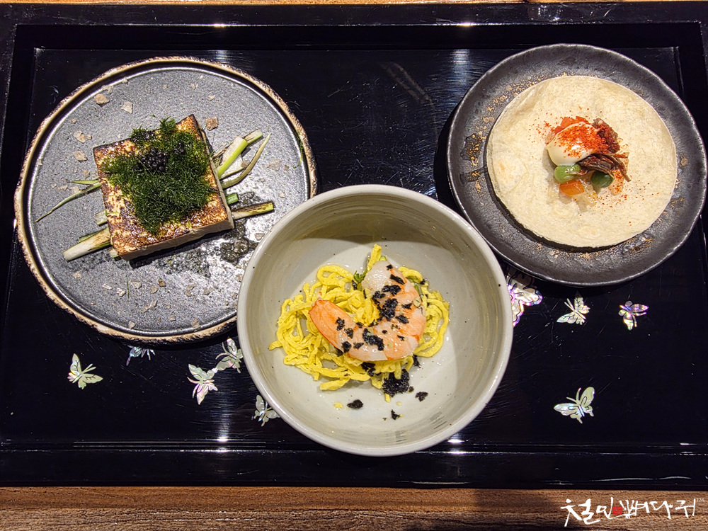 밥 짓는 사이에 3개의 식전요리가 제공됩니다.