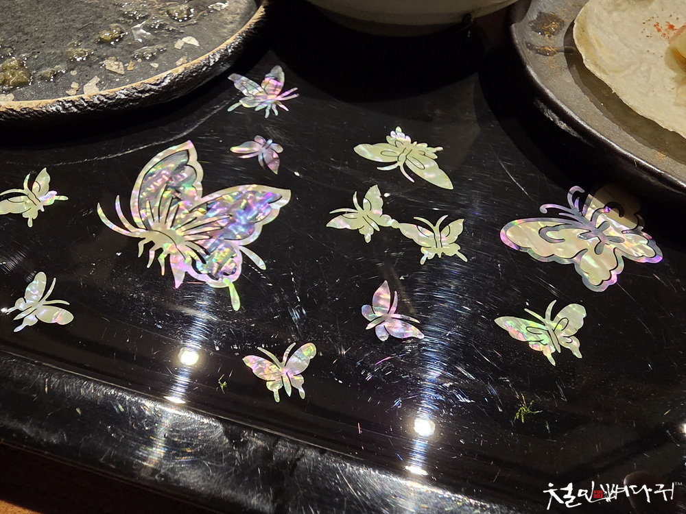식전요리 담은 쟁반은 자개쟁반입니다.