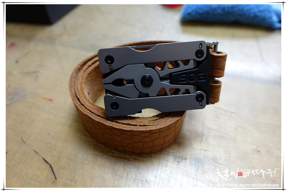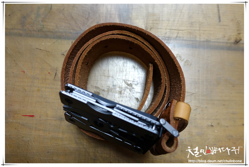 밸트 버클형 멀티툴이 수작업된 가죽밸트와 만나 완성되었습니다.