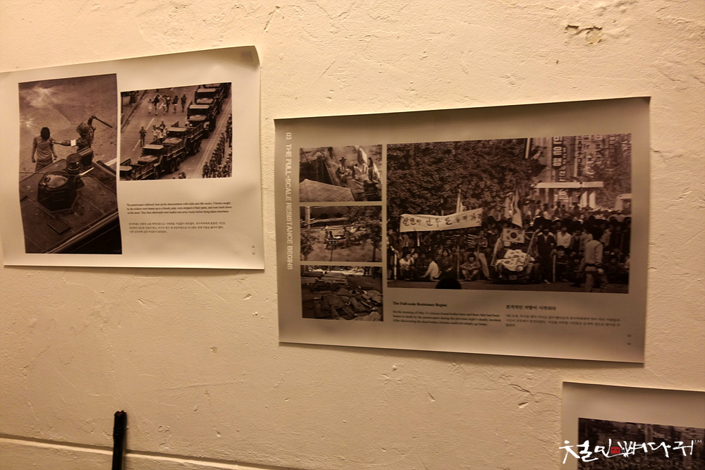 1층 벽면, 2층 올라가는 계단에는 광주 5.18 관련 사진들이 붙어있습니다.