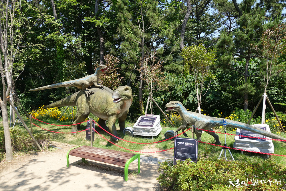 실물 크기의 공룡 모형들인데, 움직이고 소리도 나는 사실적인 모형입니다.