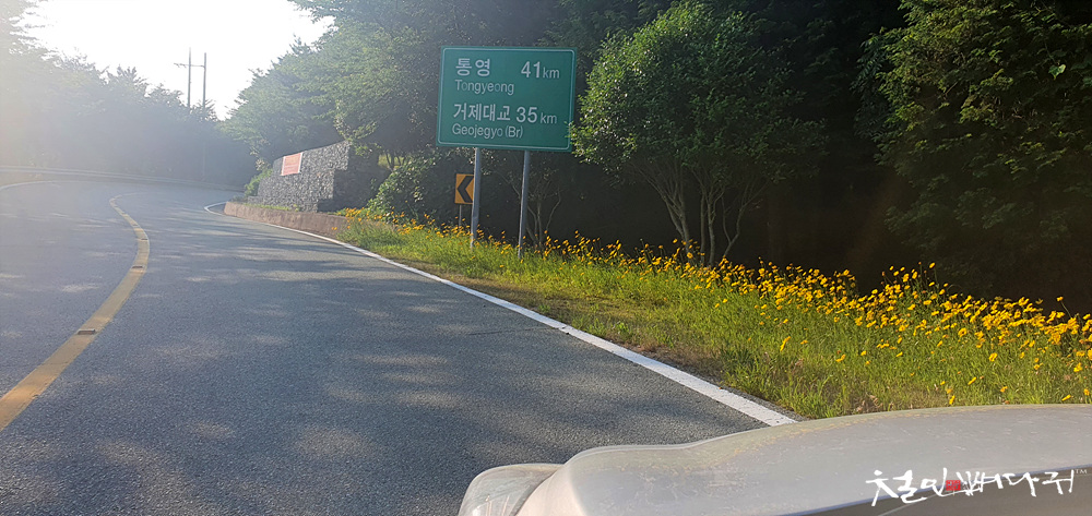 한참 전부터 달려가던 중, 거제대교와 통영까지의 거리가 표시된 이정표도 보고,