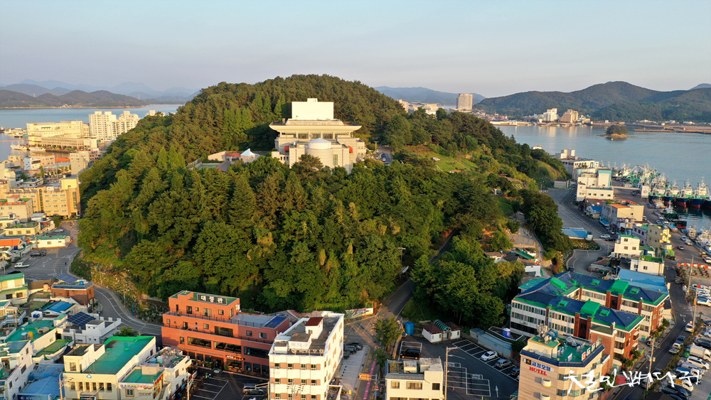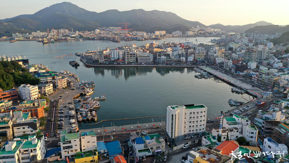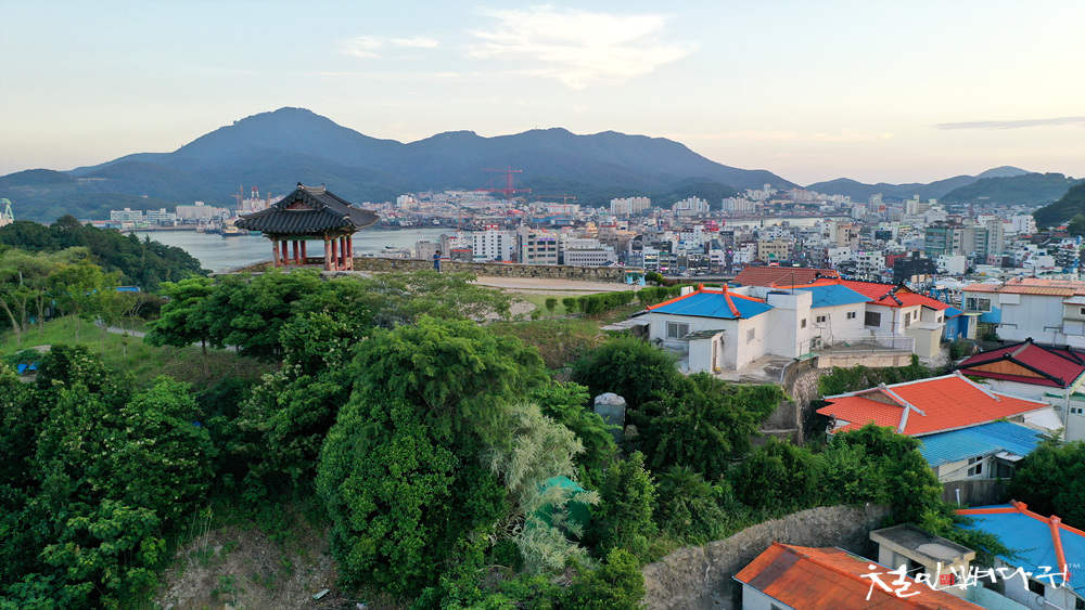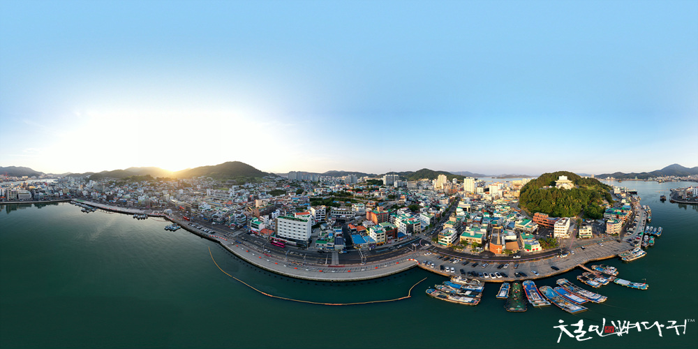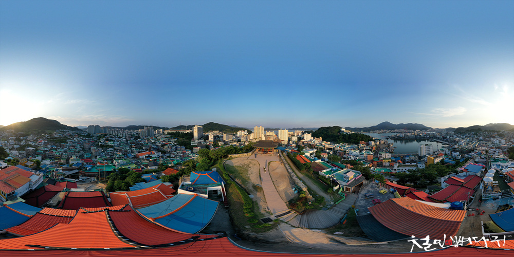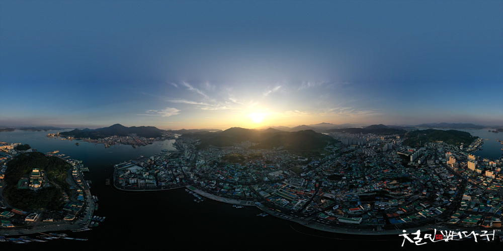 동피랑 상공에서 서쪽 방향 노을 지는 통영 파노라마