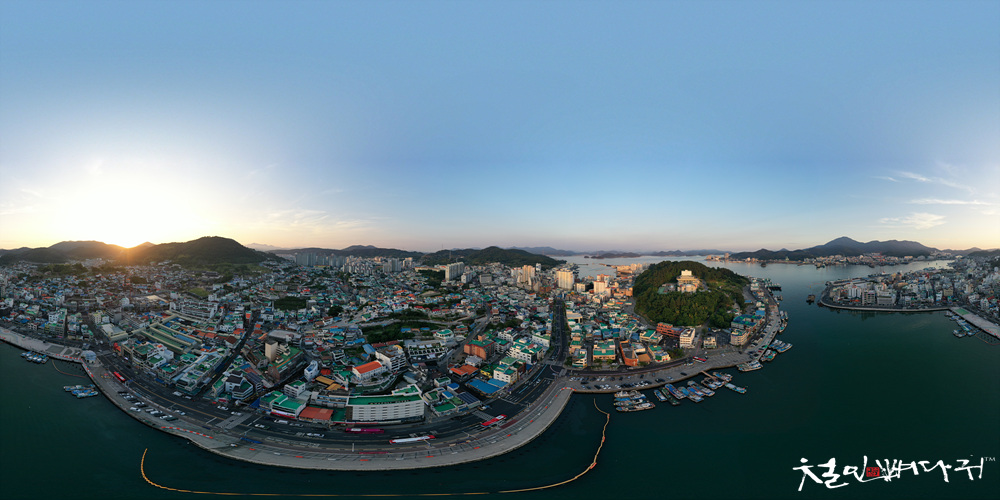 노을지는 저녁 하늘이 있는 통영 파노라마