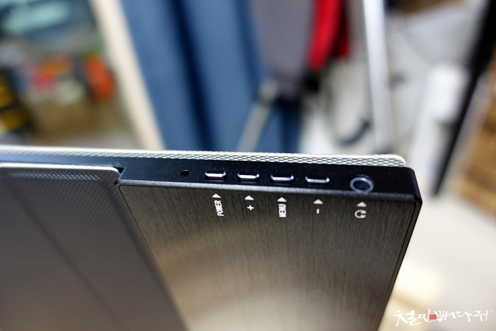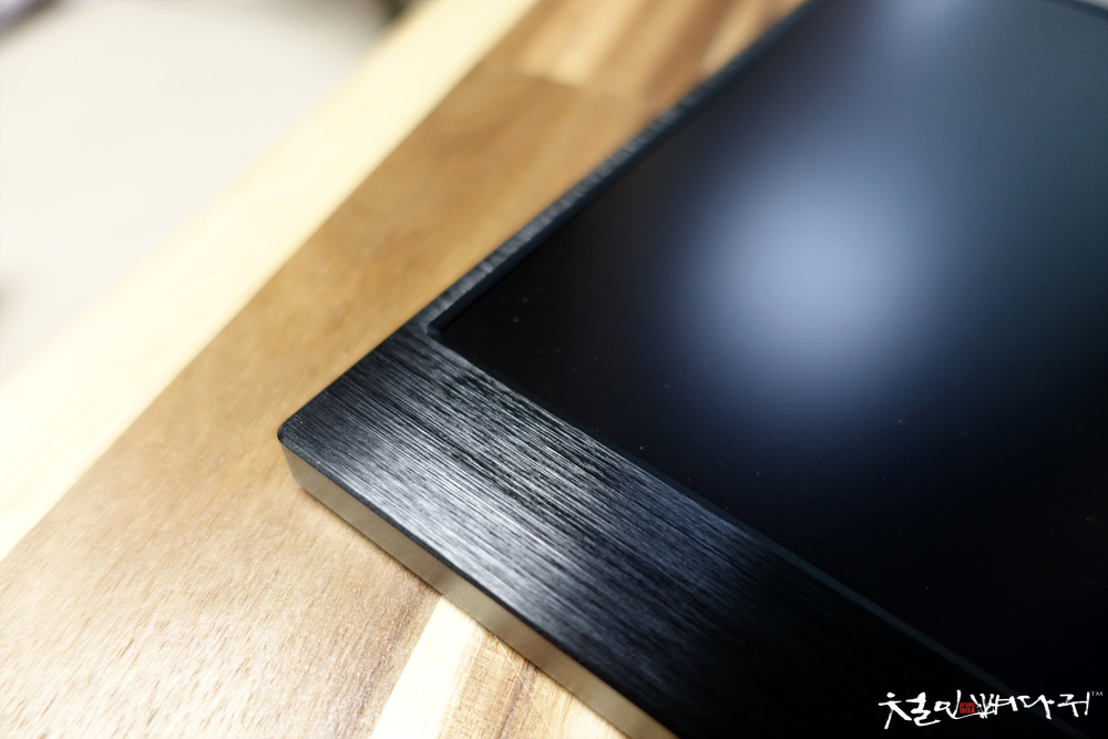 옆쪽과 위쪽은 아주 얇은 베젤이고, 아래쪽은 두꺼운 베젤 형태를 하고 있습니다.