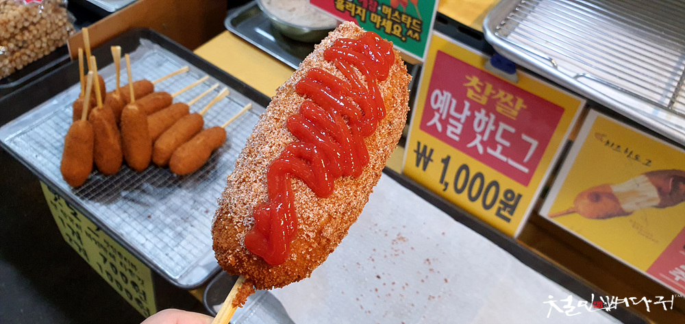 도마큰시장의 왕핫도그는 크기와 가격이 매리트가 있는데, 속에 넣는 소시지를 더 맛있는 것을 사용하고 가격을 올려도