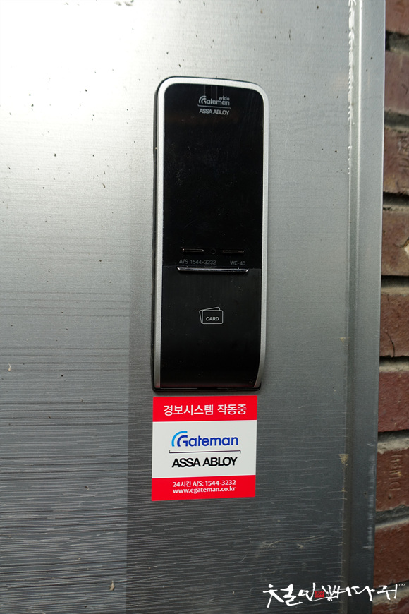 모든 설치를 마치고, 동봉되어 있던 경보시스템 작동 중 스티커를 붙여주었습니다.