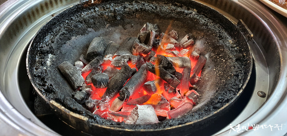 숯불이 나와서, 테이블에 올려지고,