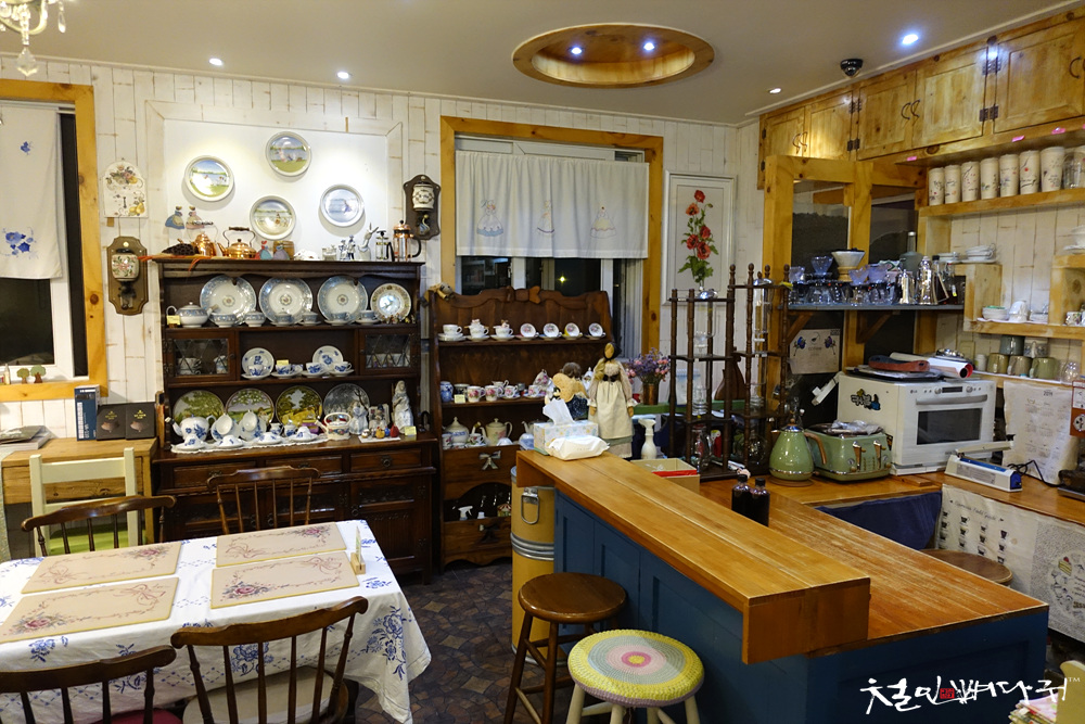 카페 인테리어는 고급스러운 접시, 컵들로 가득했고,
