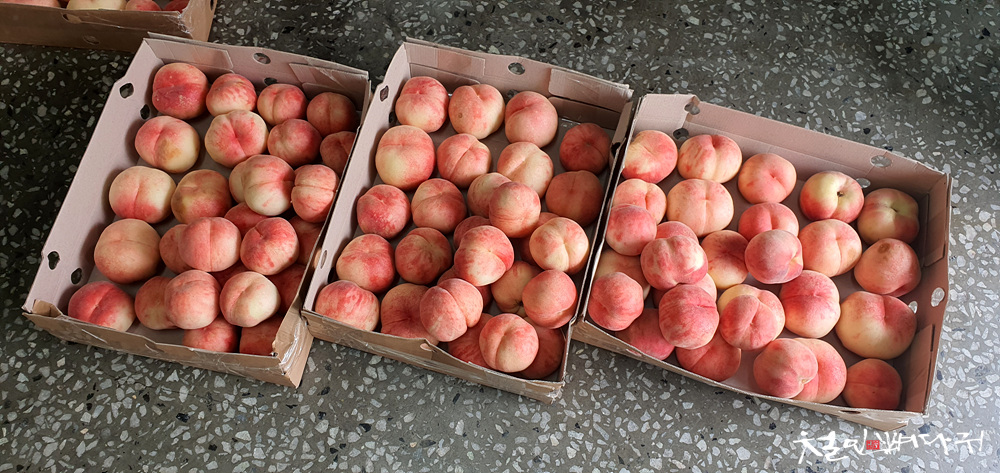 복숭아를 싸게 공급받았으니 서로서로 좋은 게 좋다고 전달해주기로 합니다.