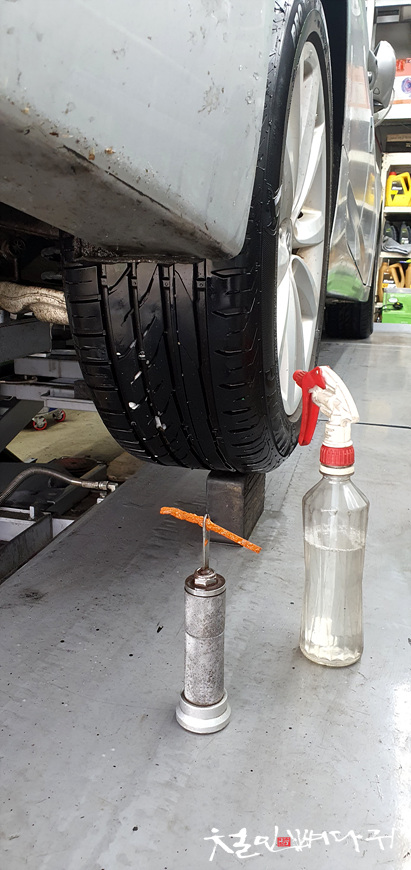 타이어 안으로 지렁이본드를 강제적으로 매립해서 펑크 난 곳을 막아주고,
