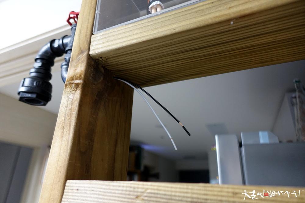 사진처럼 진열장에 뚫은 구멍으로 전기선을 뽑아내 줍니다.