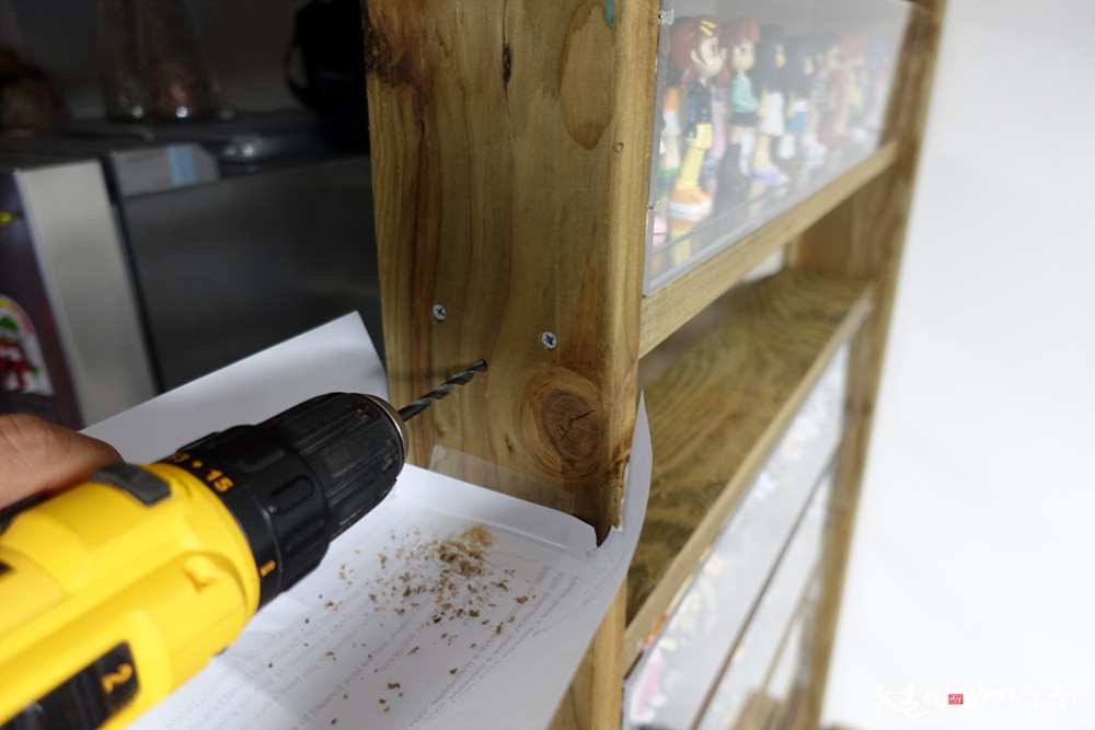A4용지를 붙여서 구멍을 뚫으면서 나오는 나무가루들을 모아주었습니다.