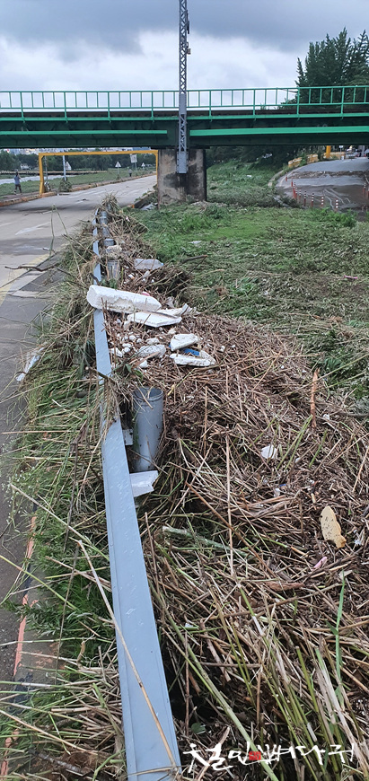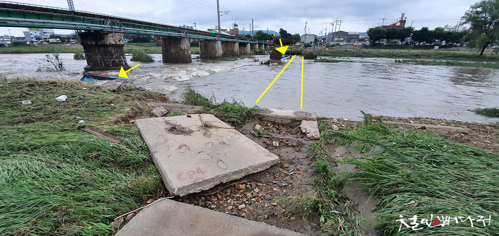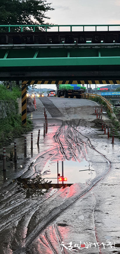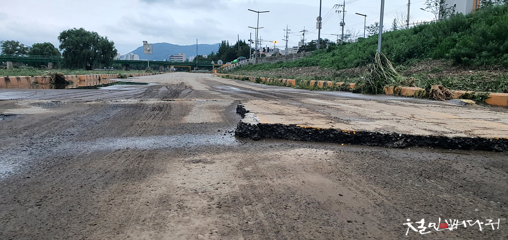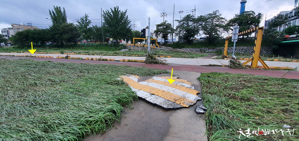 어디서 아스팔트가 떠내려왔다 싶었는데, 하상도로의 방지턱이 부서져서 물의 부력에 의해 옮겨진 것이었습니다.