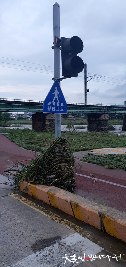 조금 두꺼운 신호등은 물에 떠내려온 수풀들이 걸려있지만, 튼튼하게 잘 서있습니다.