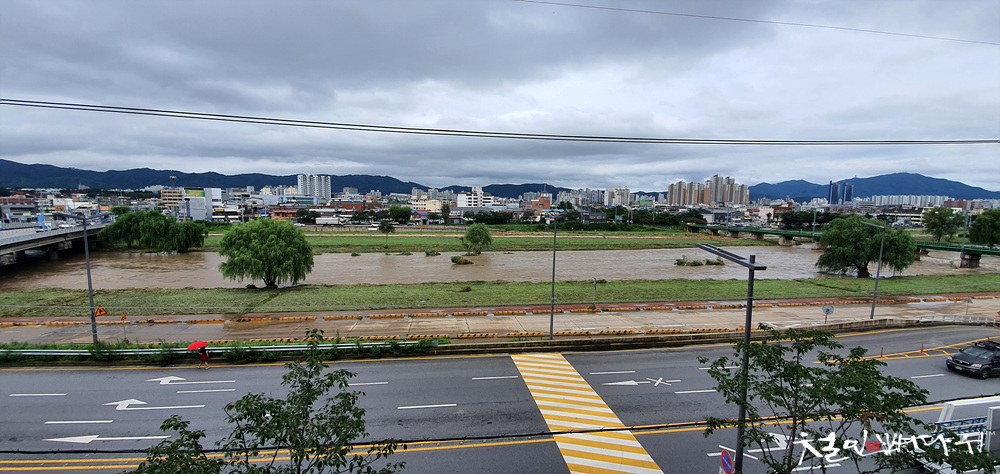 날이 밝아오면서, 아침 6시쯤이 되어 밖을 보니 대전천이 범람할 것 같은 높이로 물이 차오르고 있었습니다.