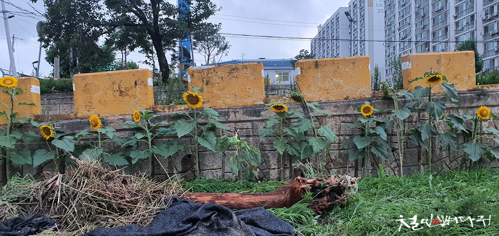 해바라기 꽃 있는 아래 정도까지 물이 찼었습니다.
