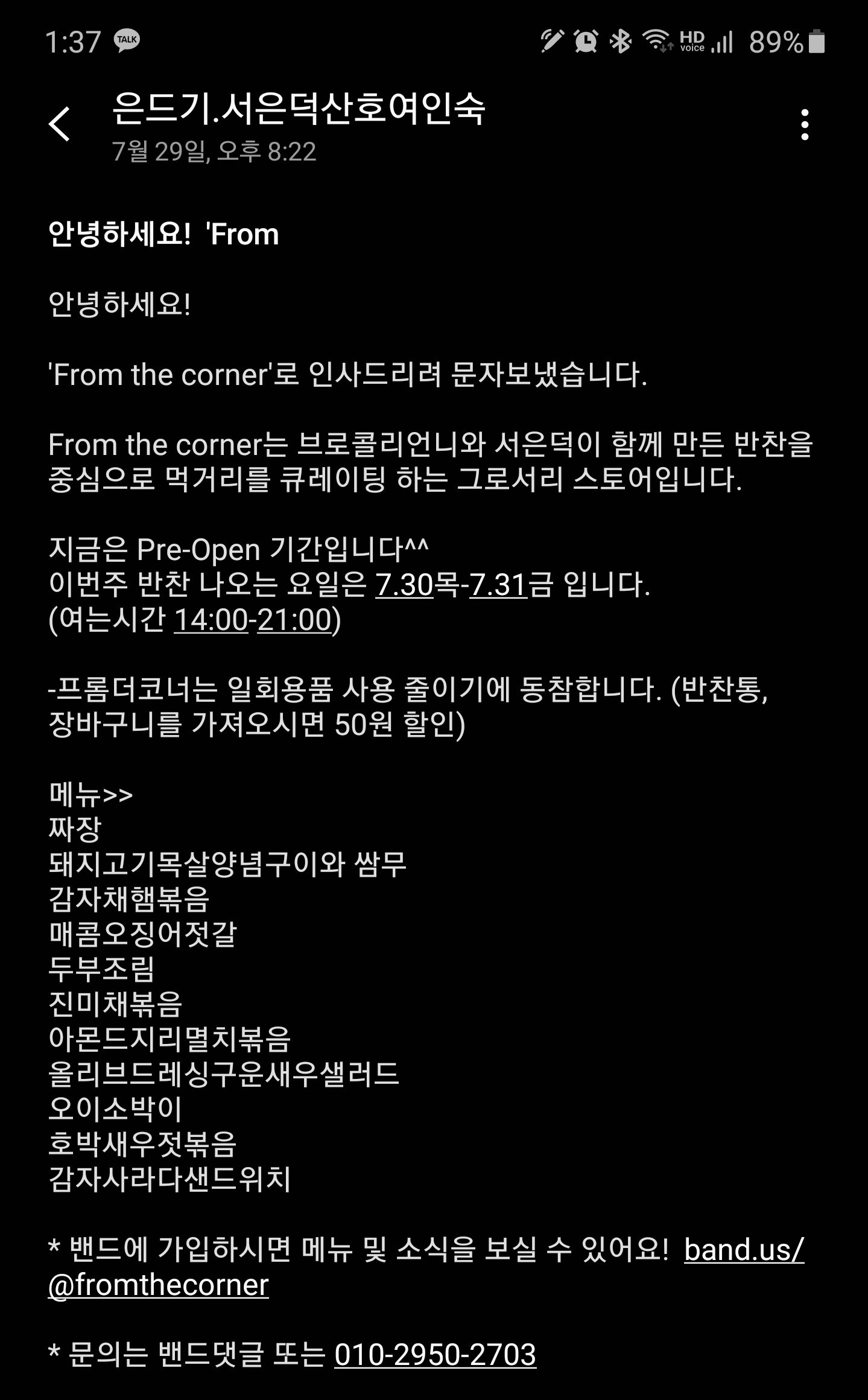 메시지 마지막에 있는 밴드주소 - band.us/@fromthecorner