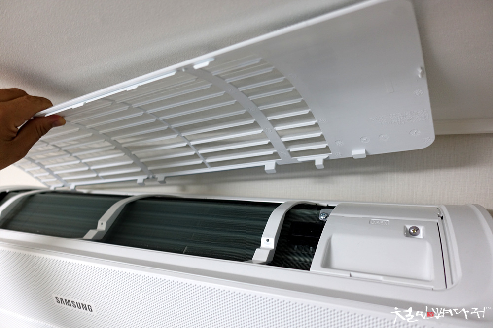 벽걸이 무풍 에어컨 상부의 필터를 떼어내고, 필터는 물로 씻어서 말려주었습니다.