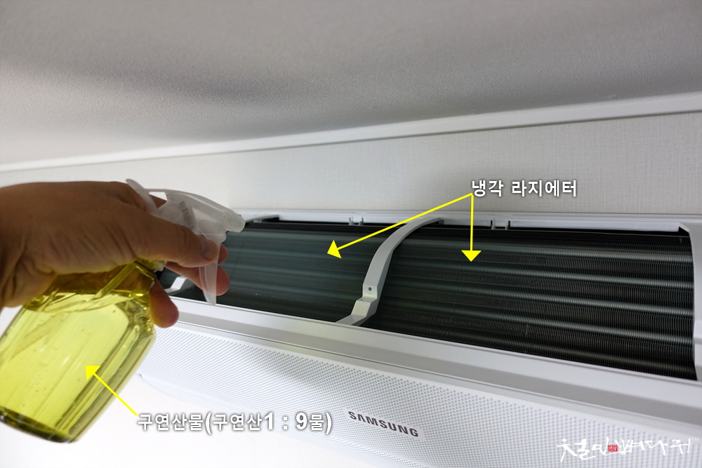 분무기에 물 9 : 1 구연산을 섞어서 녹여주는 것으로 간단히 에어컨 냄새 제거 용액을 만들 수 있습니다.
