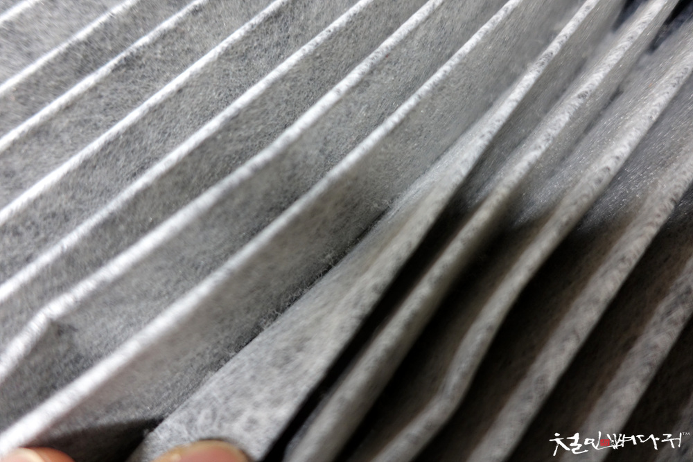 사용한 필터의 공기가 흡입되는 바닥 쪽을 보면, 먼지들이 많이 흡착이 되어 있습니다.