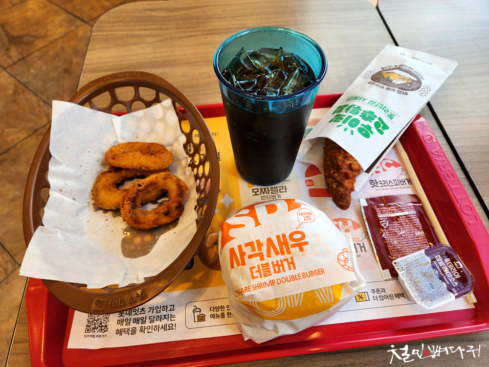 새우버거 선택했고, 롱치즈스틱과 오징어링 주문.