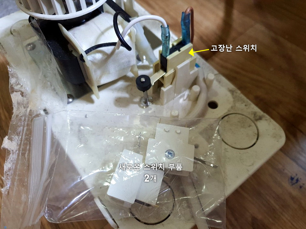 에어컨 배수펌프의 고장난 스위치 위치와 새로 도착한 스위치 2개입니다.
