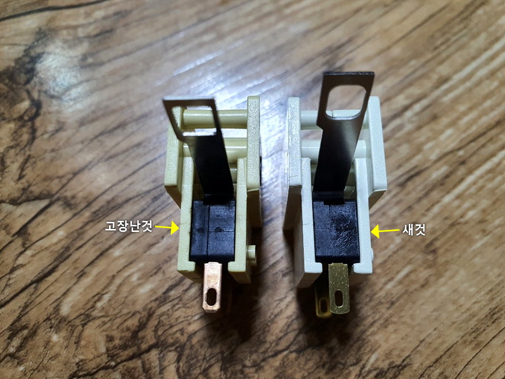 고장 난것은 그동안 사용한 기간이 있어서 누렇게 색이 바랬고, 새것은 하얀색에 가까운 밝은 색입니다.