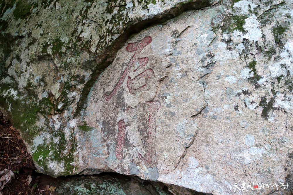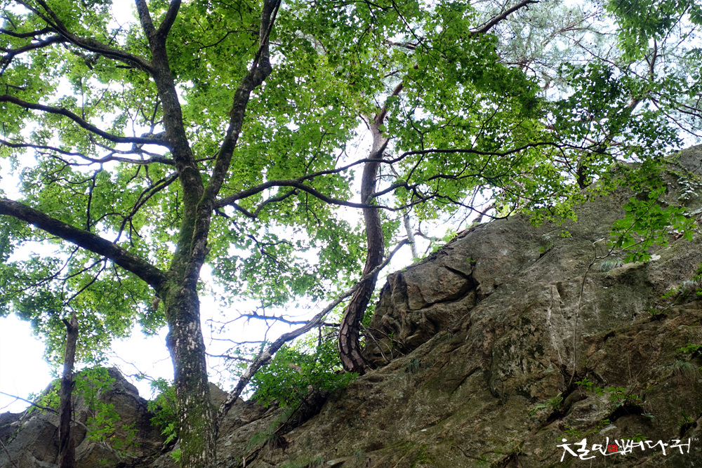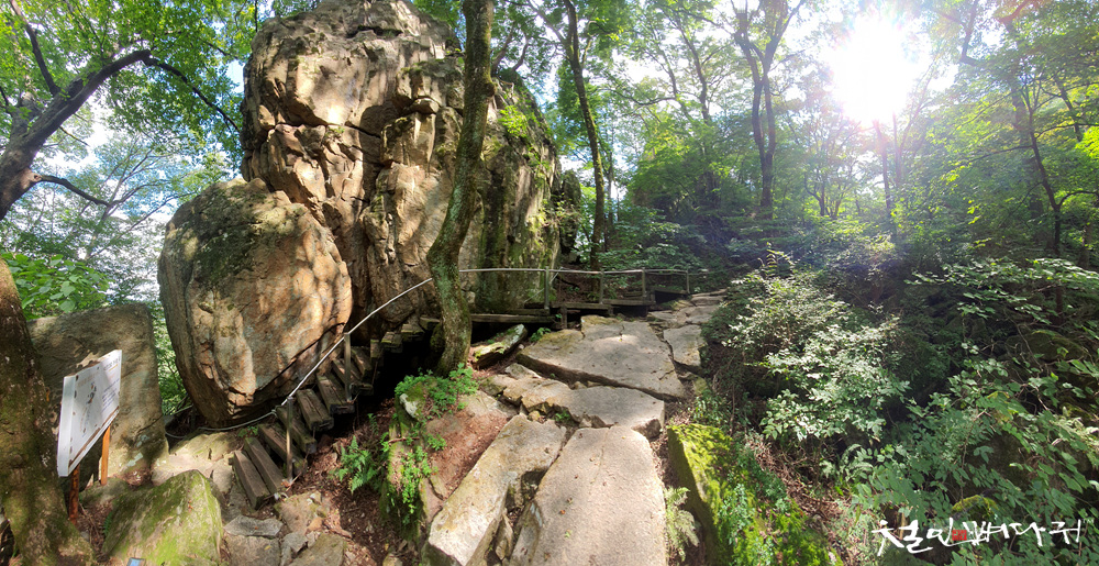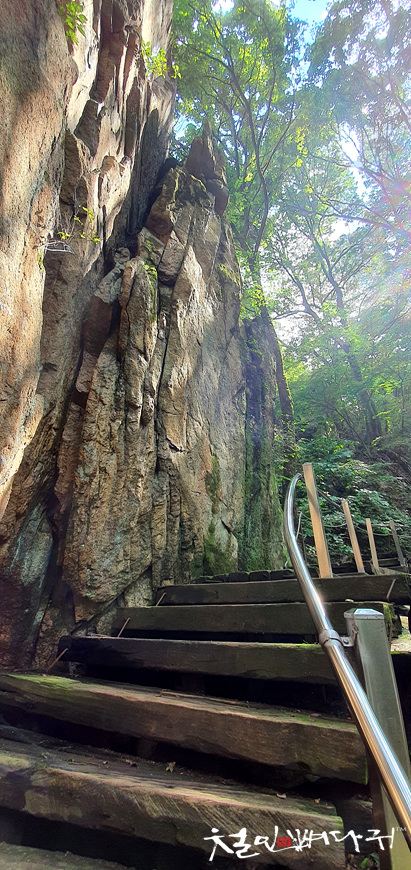 깊은 숲 속의 나무계단을 따라 올라가면, 왼편으로 커다란 바위 절벽이 있습니다.