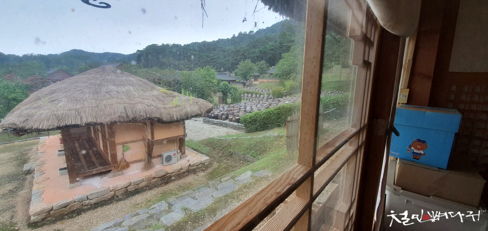 명재고택 장독대가 살짝 창 너머로 보입니다.
