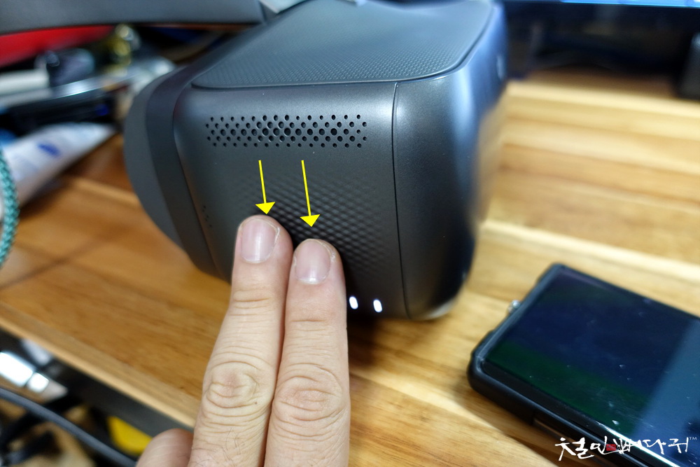 DJI고글 기능은 옆면 터치패드를 두 손가락을 사용해서 아래로 내리면,
