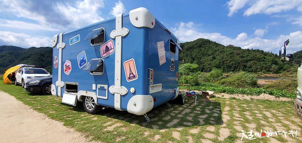 금산 적벽강에 캠핑하는 형님가족 만나러 갔다가, 이웃으로 캠핑하고 있던 여행가방 모양의 카라반이