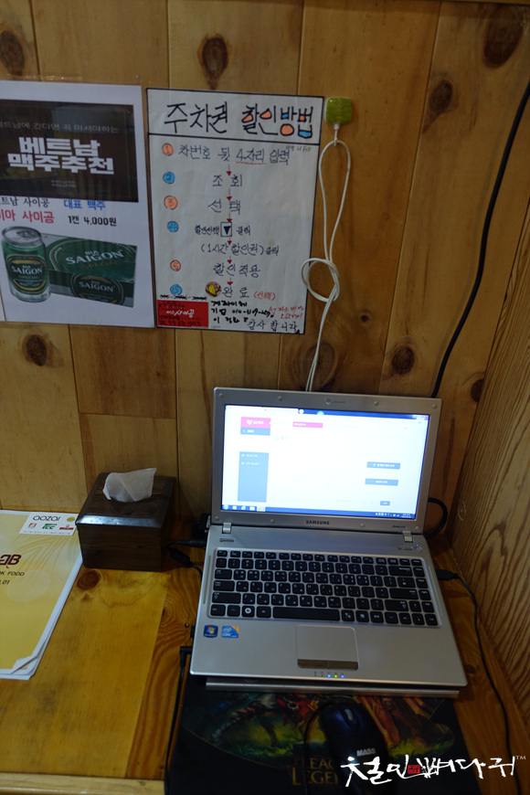 건물 지하에 주차장 나오려면, 식당에 있는 컴퓨터에 차량번호 등록해서 1시간 무료 적용받으면 됩니다.