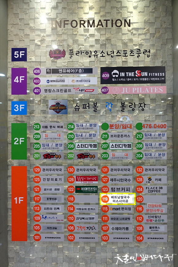 베트남 쌀국수 미스 사이공 식당이 있는 건물에 있는 상점들 리스트입니다.