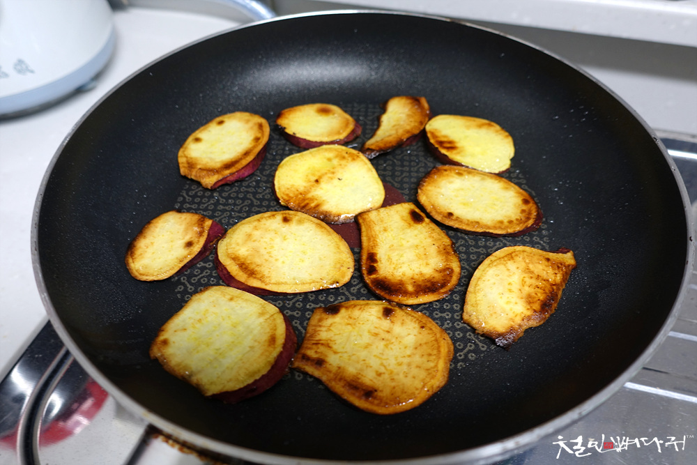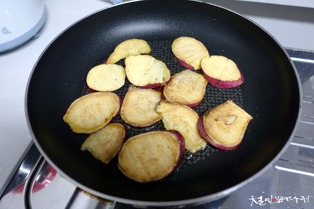 슬라이스로 잘라준 고구마를 프라이팬에 올려주고, 굽기 시작합니다.